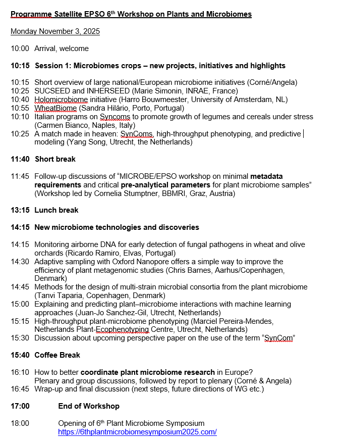 The EPSO Working Group on Plants and Microbiomes announces that the sixth workshop will take place in Malaga on 3 November 2025 as a Satellite Workshop of the 6th Plant Microbiome Symposium in Malaga/Antequera, Spain, 3-7 November 2025. The originally planned workshop in Utrecht (8-9 April 2025) is cancelled.